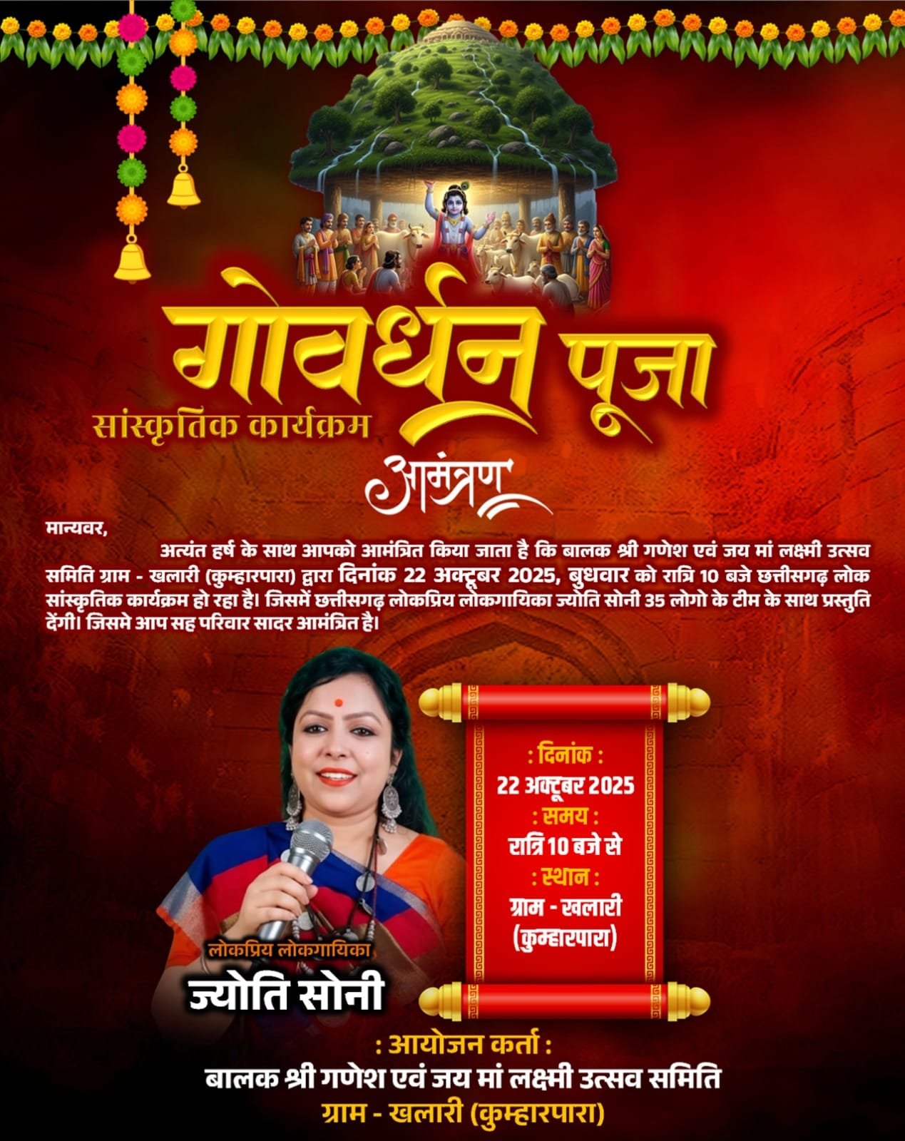 ज्योति सोनी ( लोकप्रिय छत्तीसगढ़ी लोकगायिका ) खलारी में गोवर्धन पूजा के अवसर पर देगी रंगारंग लोक सांस्कृतिक कार्यक्रम l