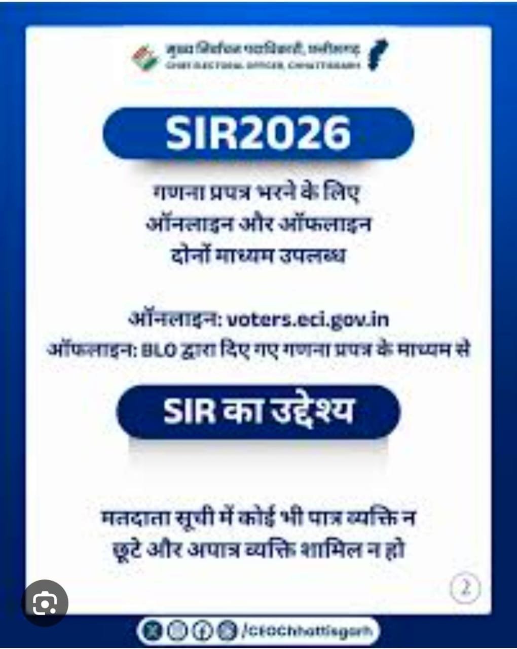 मुख्य निर्वाचन पदाधिकारी, ने मतदाताओं से अपील की है कि जब बीएलओ आपके घर आएँ. तो कृपया उन्हें आवश्यक सहयोग प्रदान करें। बीएलओ के पास पहले से मतदाता सूची 2025 के विवरण के अनुसार आपके नाम, पता और EPIC नंबर सहित प्री-प्रिंटेड एन्यूमरेशन फॉर्म होगा। जिन परिवारों में कोई नया सदस्य 1 जनवरी 2026 तक 18 वर्ष की आयु पूर्ण कर चुका है. उनका नाम मतदाता सूची में जोड़ने के लिए बीएलओ द्वारा फॉर्म-6 उपलब्ध कराया जाएगा। यदि किसी परिवार सदस्य का निधन हो गया हो या वह अन्यत्र स्थानांतरित हो गया हो, तो उसकी जानकारी भी बीएलओ को दें ताकि सूची से नाम विलोपित किया जा सके। हर सदस्य को दो फॉर्म BLO की तरफ से दिया जाएगा दोनों फार्म पर पासपोर्ट साइज की फोटो लगेगी जिसमें स्वयं के हस्ताक्षर होंगे ।एक फॉर्म BLO लेकर जाएंगे एक फॉर्म घर पर ही रहेगा जिसमें BLO के हस्ताक्षर होंगे । इस SIR फॉर्म को सभी नागरिक को जमा करना जरूरी होगा । यदि आप किसी कारणवश फॉर्म जमा नहीं करते हैं तो आप मतदान करने से वंचित हो जाएंगे । यदि आप निवास स्थान से अन्यत्र जगह पर रहते हैं तो आप क्षेत्र के बीएलओ से संपर्क कर सकते हैं ।