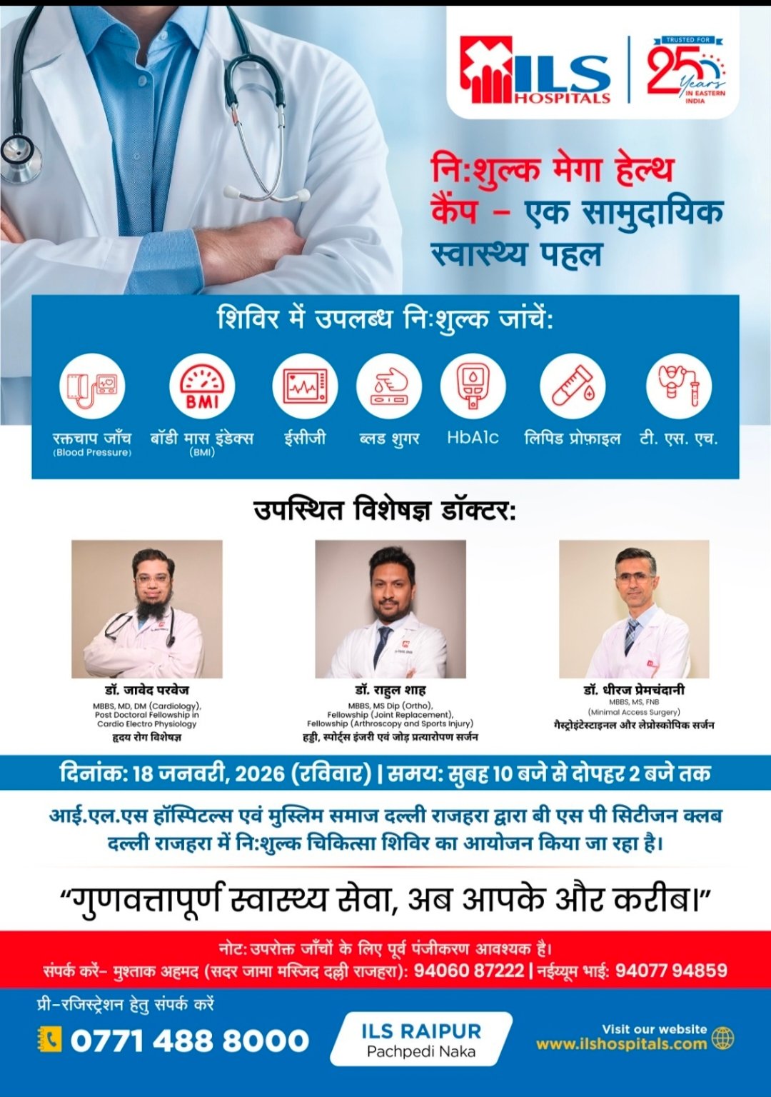 मुस्लिम समाज दल्ली राजहरा के अध्यक्ष (सदर) मुश्ताक अहमद ने प्रेस विज्ञप्ति जारी कर बताया कि आई एल एस अस्पताल पचपेड़ी नाका रायपुर और मुस्लिम समाज राजहरा के संयुक्त तत्वावधान में कल दिनांक 18-01-2026 दिन रविवार को सुबह 10 बजे से दोपहर 2 बजे तक निःशुल्क स्वास्थ्य शिविर का आयोजन सिटीजन क्लब दल्ली राजहरा में किया गया है। जिसमें मरीजों की निम्न जांचो को निःशुल्क किया जावेगा।