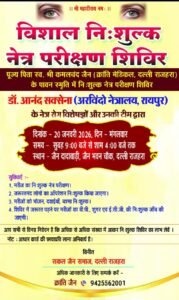 इस नेत्र शिविर के आयोजन में डॉ. आनंद सक्सेना (अरविंदो नेत्रालय, रायपुर)के नेत्र रोग विशेषज्ञों और उनकी टीम द्वारा के सहयोग से दिनांक 20 जनवरी 2026, मंगलवार सुबह 9:00 बजे से शाम 3 बजे तक जैन दादाबाड़ी, जैन भवन चौक, दल्ली राजहरा में होगा।