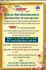 सी.एस.आर. विभाग, भिलाई इस्पात संयंत्र एवं मानव संसाधन विभाग, लौह अयस्क समूह राजहरा के संयुक्त तत्वावधान में आयोजित सांस्कृतिक संध्या छत्तीसगढ़ का प्रसिद्ध लोक कला मंच “जवांरा” ग्राम- पेन्ड्री (कलंगपुर) गुण्डरदेही द्वारा मनमोहक सांस्कृतिक प्रस्तुति आज बुधवार 11 फरवरी 2026 संध्या 7:30 बजे से बी.एस.पी. स्कूल क्रमांक 06, दल्ली राजहरा में आयोजित किया जा रहा है ।