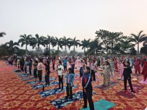 कार्यक्रम के मुख्य अतिथि के रूप में अपर कलेक्टर महोदय श्री चंद्रकांत कौशिक जी की उपस्थिति हुई एवं योग प्रशिक्षक श्री धीरज शर्मा द्वारा जुंबा डांसिंग अभ्यास से कार्यक्रम का शुभारंभ किया गया। मंच पर टीम गुरु ग्रेस योगा एंड वैलनेस स्टूडियो के नियमित योगाभ्यासी श्री दिनेश कुमार साहू, रंजीता उपाध्याय, चांदनी साहू व गंजीर सर ने डेमो दिया। प्रशासनिक अधिकारियों, कर्मचारियों, पुलिस के जवान, पत्रकार वर्ग, गणमान्य नागरिक एवं व्यवसायी वर्ग सहित स्कूल कॉलेज के छात्र छात्राओं का योग के प्रति लगाव एवं उत्साह देखने लायक था। प्रशिक्षक धीरज शर्मा के साथ डांसिंग बीट वाली धुनों पर जुंबा डांसिंग में लोगों ने जमकर पसीना बहाया एवं योग अभ्यास के लिए शरीर को तैयार किया। तत्पश्चात सूर्य नमस्कार, आसन, प्राणायाम व ध्यान का अभ्यास कराया गया।