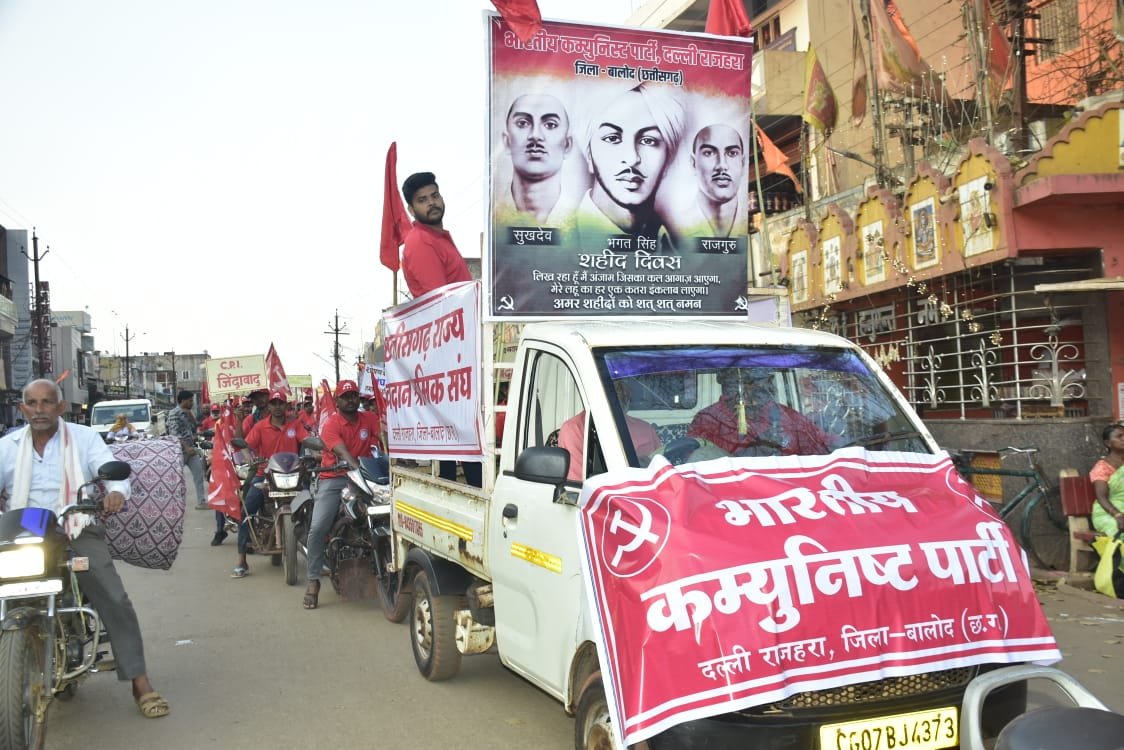 आज शहीद दिवस के अवसर पर भारतीय कम्युनिस्ट पार्टी (CPI), दल्ली राजहरा द्वारा महान क्रांतिकारी भगत सिंह, सुखदेव और राजगुरु की स्मृति में एक भव्य बाइक रैली का आयोजन किया गया और 95 वे शहादत दिवस मनाया गया रैली का शुभारंभ शाम 5:00 बजे CPI पार्टी कार्यालय से हुआ, जो शहर के मुख्य मार्ग, नया बाजार और पुराना बाजार होते हुए बी एस पी टाउनशिप से नियोगी चौक (बस स्टैंड) पहुंची।