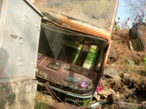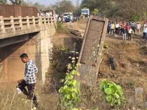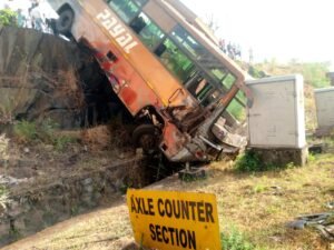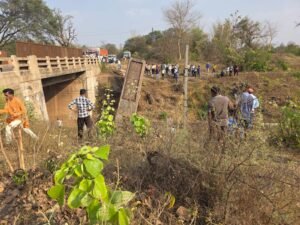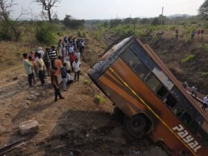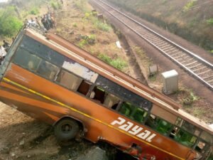 दल्ली राजहरागुरुवार 09 अप्रैल 2026भोज राम साहू 9893765541 राष्ट्रीय राज मार्ग 930 में जम्ही गांव के पास की घटनाआज दोपहर लगभग 3:15 बजे के बीच पायल बस ट्रैवल की बस क्रमांक CG 7 E 1129 जो की बालोद से दल्ली राजहरा आ रही थी कुसुमकसा से लगभग 2 किलोमीटर पहले जम्ही गांव को पार कर गांव से लगभग 200 मीटर दूर रेल्वे ब्रिज के लगभग 40 फीट नीचे दाएं ओर रेल्वे पटरी के किनारे सीधे गिर गई । गिरते समय इलेक्ट्रानिक बोर्ड और चट्टान के बीच फ़सने के कारण कोई गंभीर दुर्घटना नहीं घट पाई यदि बस सीधे रेल्वे ट्रैक पर गिरती तो जनहानि हो सकती थी । हादसे की बाद चीख पुकार मच गई ।प्रत्यक्ष दर्शियों ने बताया कि बस में लगभग 12 से 15 सवारी बैठे थे । गांव वाले और राहगीरों की मदद से सभी को बस से बाहर निकला गया । किसी को गंभीर चोट नहीं आई थी । घटना के समय सभी यात्री दहशत में थे। यात्रियों को बाहर निकालने के बाद पानी पिलाया गया । कुछ देर बाद सभी गंतव्य की ओर दूसरे बस से बैठकर चले गए । हादसे के बाद से बस का ड्राइवर और कंडक्टर फरार है । घटना कैसे हुई यह तो जांच के उपरांत ही पता चलेगा लेकिन राहगीरों ने बताया कि बस की गति बहुत तेज थी और घटनास्थल पर मोड होने के कारण ड्राइवर बस पर नियंत्रित नहीं कर पाया और बस पुल से नीचे गिर गया । हादसे के लगभग आधा घंटे बाद का समय दल्ली राजहरा से मड़ौदा की ओर जाने वाली पैसेंजर ट्रेन का होता है यदि घटना के तुरंत बाद ट्रेन आ गया रहता और यदि ट्रेन की चपेट में बस सहित सवारी होते तो गंभीर दुर्घटना घट सकती थी ।फिलहाल हादसे के बाद राजहरा पुलिस और आरपीएफ की टीम घटना स्थल पर पहुंच कर घटना स्थल का निरीक्षण किया गया । आर पी एफ हाइड्रा मंगवाकर बस को उपरोक्त स्थल से बाहर निकालने में लगे थे ।Spread the lovePost navigationराजहरा प्रीमियर लीग सीजन-5 महेश के हरफनमौला प्रदर्शन के बदौलत यस टी -11 ने फाइनल मैच 53 रन से जीता।