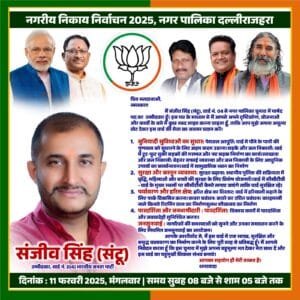 दल्ली राजहरा। नगर निगम चुनाव में भारतीय जनता पार्टी (भाजपा) की बड़ी जीत के बाद वार्ड क्रमांक 04 के नव-निर्वाचित पार्षद संजीव सिंह ने अपने वार्ड और नगर के विकास को प्राथमिकता देने की बात कही। उन्होंने भाजपा की कार्यप्रणाली की सराहना करते हुए कहा कि यह जीत जनता के विश्वास और पार्टी की मजबूत नीतियों का परिणाम है।