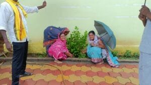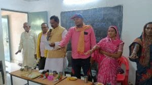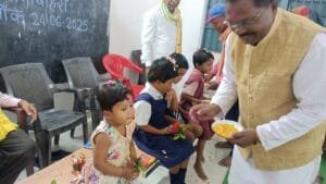 साथ ही आगन बाड़ी के बच्चों के पालकों द्वारा आ० बा० शिक्षिका एवं सहायिक को साड़ी एवं श्री फल से भेंट कर स्वागत किया।