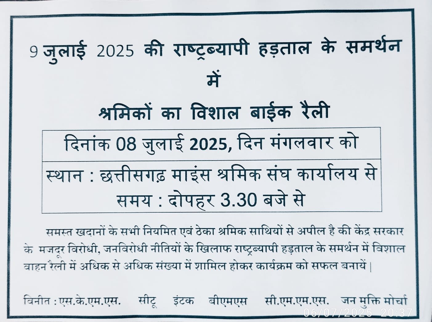 जनक लाल ठाकुर ( पूर्व विधायक छत्तीसगढ़ मुक्ति मोर्चा प्रमुख एवं जिला किसान संघ संरक्षक छत्तीसगढ़ मुक्ति मोर्चा _ प्रमुख _ (श्री जनक लाल ठाकुर, पूर्व विधायक एवं जिला किसान संघ संरक्षक) ने बताया कि आगामी 9 जुलाई 2025 को देश भर के ट्रेड यूनियनो द्वारा मौजूदा सरकार द्वारा नियमित व ठेका श्रमिकों द्वारा वर्षों पुराने संविधान में उल्लेखित श्रम कानून को अवैधानिक तरीके से खत्म कर 44 श्रम कानूनों को मात्र 4 श्रम संहिता कोड में परिवर्तित कर पूंजीपति वर्ग को लाभ पहुंचाने की नियत को देखते हुए पूरे देश भर के श्रमिक संगठनों ने सरकार की इस दुर्भाग्यजनक नीति के विरोध में देश व्यापी हड़ताल का आव्हान किया है।