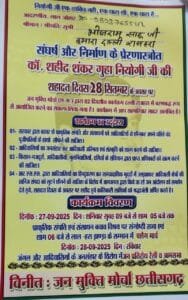इस विषय पर जन मुक्ति मोर्चा छत्तीसगढ़ द्वारा शहीद कॉ. शंकर गुहा नियोगी जी की शहादत दिवस के अवसर 02 दिवसीय कार्यक्रम करने का संकल्प लिया गया है। दिनाँक 27 सितंबर 2025 को छत्तीसगढ़ की वर्तमान भयावाह स्थिति और प्राकृतिक सम्पत्ति और संसाधन के बचाव विषय पर संगोष्ठी सभा का आयोजन गोंडवाना भवन दल्ली राजहरा में किया जा रहा है एवं शहीद शंकर गुहा नियोगी जी की शहादत को श्रद्धाजंली अर्पित करने एवं जंगल और आदिवासियों के जनसंहार के विरोध में दिनाँक 28 सितंबर 2025 को जन प्रतिरोध रैली व आमसभा का आयोजन दल्ली राजहरा में किया जावेगा।
