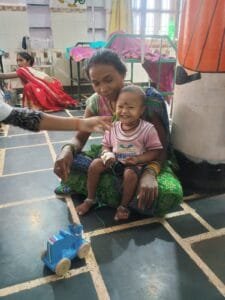 अस्पताल में बच्चे किसी न किसी शारीरिक समस्या के कारण भर्ती थे l जिसके कारण ये बच्चे त्यौहार की खुशियों में शामिल नहीं हो पाए l उनके साथ अस्पताल में उपस्थित परिजन जिसमें मां भी थी , मायूस नजर आई लेकिन अस्पताल के नर्स दीदीयों ने उन बच्चों के मासूमियत को भांपकर बाजार से विभिन्न प्रकार के खिलौने लाकर बच्चों को दिए l जिससे बच्चों ने इन खिलौनों को देखकर खिलखिला उठे और अपने शारीरिक समस्या भूलकर अस्पताल परिसर में ही खेलने लग गए l