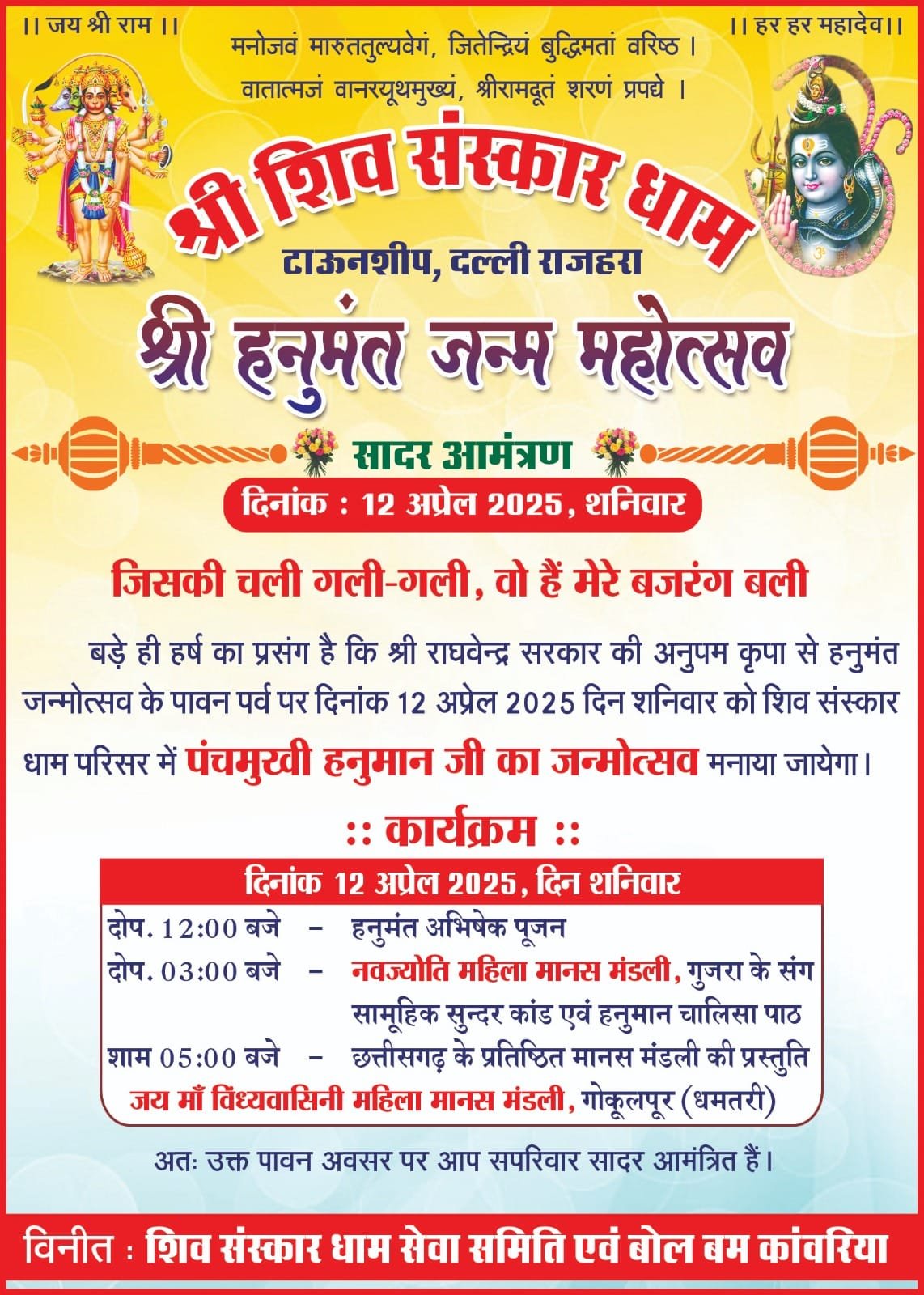 शिव संस्कार  धाम की ओर से बताया गया कि राघवेन्द्र सरकार की अनुपम कृपा से हनुमंत जन्मोत्सव के पावन पर्व पर दिनांक 12 अप्रेल 2025 दिन शनिवार को शिव संस्कार धाम परिसर में पंचमुखी हनुमान जी का जन्मोत्सव मनाया जायेगा। इस अवसर पर कार्यक्रम निम्न अनुसार होंगे l