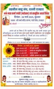 दिनांक 25.03.2025 मंगलवार को शाम 4 बजे कलशयात्रा नगर भ्रमण दिनांक : 26 मार्च 2025, बुधवार सुबह 08.00 बजे माँ कर्मा आरती सुबह 09.00 बजे बच्चों का सांस्कृतिक कार्यक्रम सुबह 11.00 बजे – बारात स्वागत दोपहर अतिथि आगमन एवं उद्बोधन दोपहर 12:00 l
