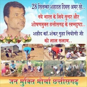 जन मुक्ति मोर्चा छत्तीसगढ़ ने शहीद कॉ.शंकर गुहा नियोगी जी के शहादत के 34वां वर्ष में, 28 सितम्बर को दो दिवसीय कार्यक्रम का आयोजन किया गया l 27 सितम्बर को दल्ली राजहरा का गोंडवाना भवन में छत्तीसगढ़ की वर्तमान भयावाह स्थिति और प्राकृतिक सम्पत्ति और संसाधन के विषय पर संगोष्ठी सभा और दिनांक 28 सितम्बर को जंगल और आदिवासियों के जनसंहार के विरोध में जन प्रतिरोध रैली का आयोजन कर मनाया गया।