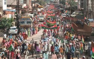 लगभग दोपहर 02 बजे लाल हरा झंडे का ध्वजारोहण शहीद कॉ शंकर गुहा नियोगी जी की पत्नी आशा गुहा नियोगी, नियोगी जी की बड़ी बहन शिला गुहा रॉय, नियोगी जी के भांजे सौमिक गुहा रॉय व अन्य साथियों के हाथों किया गया, फिर उसके बाद रैली निकाला गया यह रैली जब सुरुआत हुई तो लोगो को पुराना दिन याद आ गया जब कॉ नियोगी जी के नेतृत्व में हजारों लोग रैली में निकलते थे l यह रैली जन मुक्ति मोर्चा छत्तीसगढ़ के कृषि कार्यालय से सुरुआत हुई और घोड़ा मन्दिर चौक, मनोहर ऑफिस चौक, पुराना बाजार महुआ चौक से होकर शहीद वीर नारायण सिंह चौक पहुंचे जंहा पर साथियो द्वारा शहीद वीर नारायण सिंह जी के मूर्ति पर हार गुलाल लगा कर रैली आगे मेंन रोड से होते हुए आशा टॉकीज चौक पहुंचा जंहा पर कॉमरेड सुनील साहू और साथी द्वारा रैली में पानी पाउच का वितरण किया गया, फिर रैली आगे गुरुद्वारा के पास पंहुचा जंहा पर स्थानीय सिख समाज दल्ली राजहरा द्वारा रैली में आये साथियों के लिए शरबत पिलाया गया फिर रैली गुप्ता चौक से होकर शहीद शंकर गुहा नियोगी चौक बस स्टैंड पहुंचने पर सन्तोष कोशी, एवम साथियो द्वारा केला फल व पेय जल की व्यवस्था रैली में आये लोगो के लिए किया गया व वितरण भी किया गया l रैली आगे श्रम वीर चौक पहुंची जंहा प्रांसिस कॉलिंग व साथियों द्वारा पानी पाउच का वितरण किया गया और रैली फिर सभा स्थल जैन भवन चौक पहुंचा l जंहा पर सर्व आदिवासी समाज दल्ली राजहरा के साथियों द्वारा बिस्किट व पानी बांटा गया और विनोद कोशी, सुमोद सैम्युल, अनु मैथ्यू, साहिल दिप, बीजू मैथ्यू, चिन्ना, भूषण एवम अन्य साथियों ने भी बिस्किट का वितरण सभा मे मौजूद लोगो को किया गया।